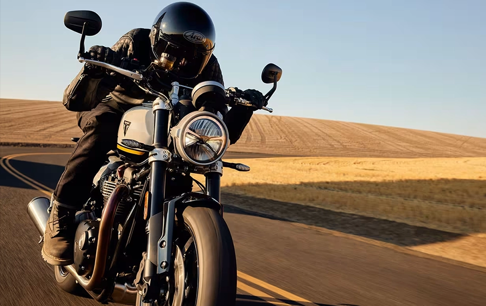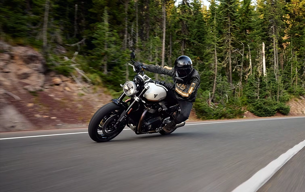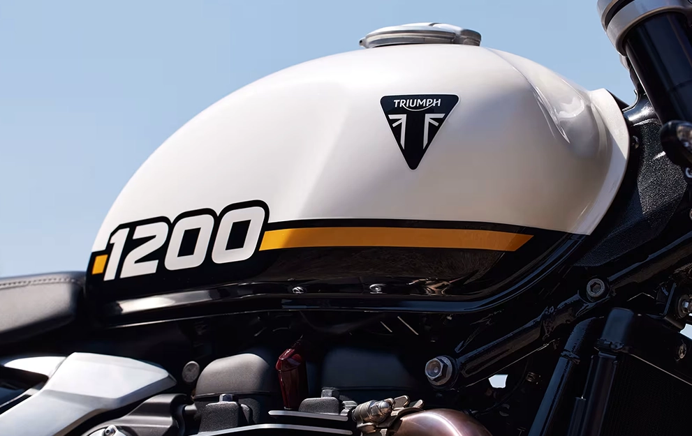 Impressionante e exigente, o design elegante e minimalista da Speed Twin 1200 evoluiu. O tanque de combustível inclinado, com recortes frontais profundos, apresenta um design definido e imponente. As coberturas do corpo do acelerador minimalistas têm acabamento em alumínio escovado e se integram aos painéis laterais no estreito quadro traseiro.