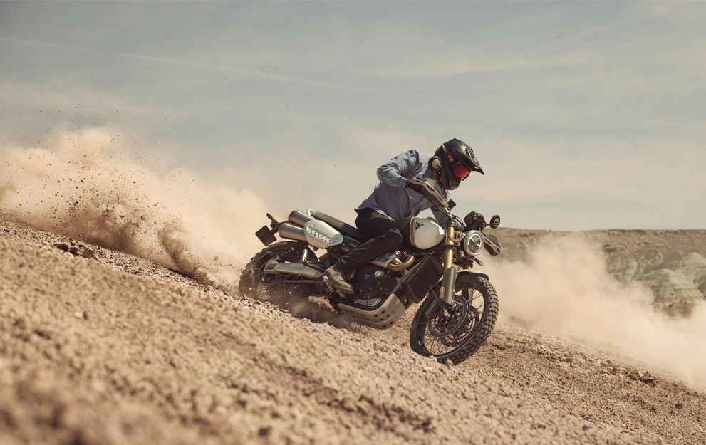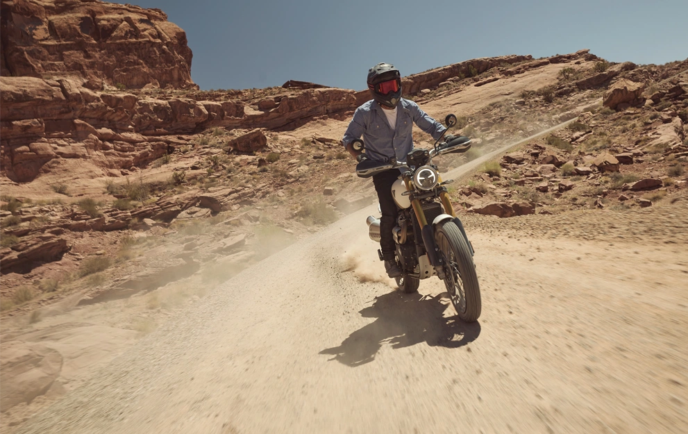 Exclusivo quadro Scrambler, com suspensão premium de longo curso e roda dianteira de 21 polegadas, proporcionam uma compostura imparável no asfalto e nas trilhas.